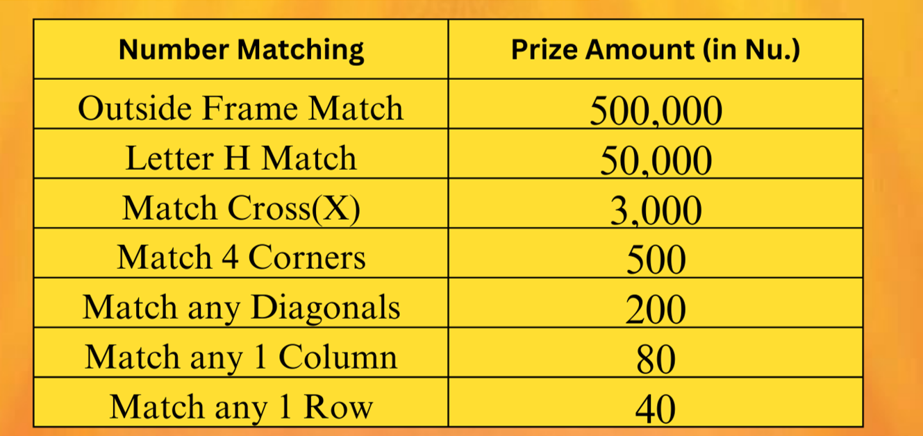 Thuensum Scratch T50 is also a number matching game where buyers match 3 or more numbers and win lowest amount. of Nu.100 and they can win up to Nu. 1,000,000 at the cost of Nu.50 per scratchcard. Thuensum Scratch is a form of pre printed Scratch and Win lottery.This product has been launched in order to provide our buyers a platform for entertainment in addition to their chances of winning.