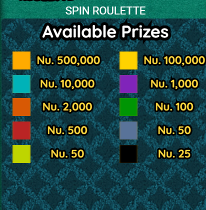 Each game starts with two spins and its Nu.25 per ticket. After each spin, the golden will point to a specific slice on the wheel. You will be awarded the item shown on that respective slice. The slice can award free spin, an amount or no win. See the prize table for details on the possible prizes. Visit www.bll.bt for details.